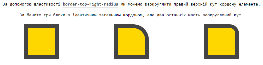 Властивість border-top-right-radius може бути використана разом з border (або будь-якої іншою властивістю, яка стилізує межі елементу) для того, щоб встановити межу, вона також може бути використана без задання інших спеціальних стилів для рамки.